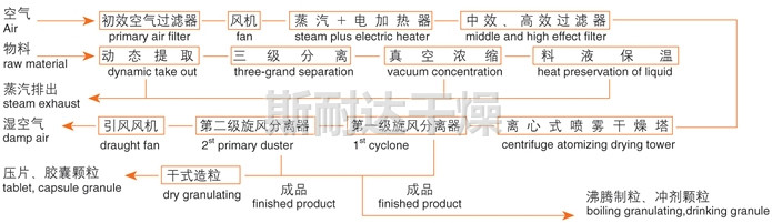该机采用全封闭形式,所有部件均采用不锈钢制造,配有三级净化装置,过滤后的空气达十万级要求。筒体与顶部装有冷壁装置,使壁温<80℃,干燥塔内装有气刷扫塔装置。经该机干燥后的中药浸膏粉,不会出现焦化变质现象,大大增加了收粉率(95%以上),而且不会产生混药现象和粘壁现象。