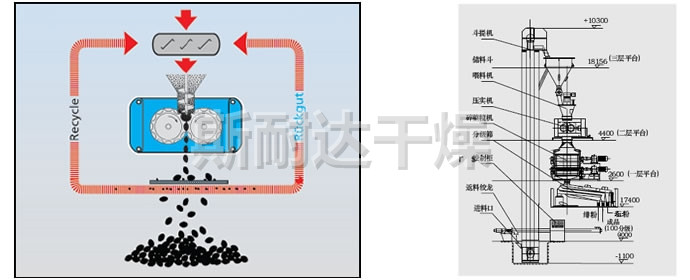 对辊式挤压造粒的工艺原理是:干物料在压力作用下团聚成致密坚硬的大块(饼料),称为挤压过程;饼料再被破碎筛分后成为颗粒料称为造粒过程。挤压的作用一是将颗粒间的空气挤掉,另外是使颗粒间距达到足够近,以产生如范德华力、吸附力、晶桥及内嵌连接等吸引力。挤压造粒的颗粒主要是靠分子之间的作用力形成的颗粒强度。