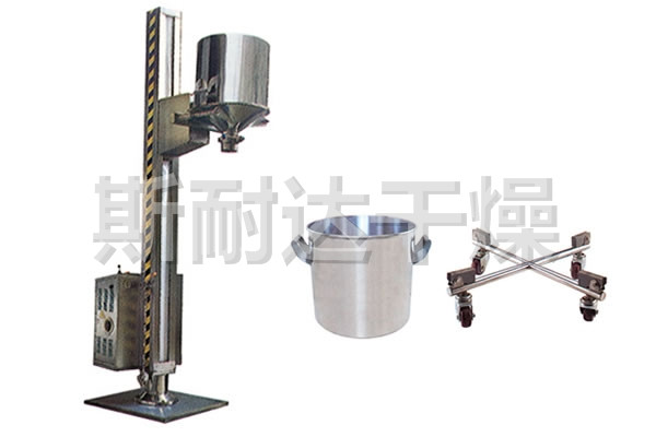 TJG 系列固定提升加料机由两部分组成,即提升机及底座。提升机由机架、液压提升系统及料门翻转机构组成。工作时,先将提升机的料门与料桶扣合,启动提升操作杆,料门与料桶一起上升,启动翻转操作杆,料桶即可番转180度,呈底桶向上姿态并移动到所需位置,利用料门上出料蝶阀,可很容易将物料加入所需的工艺设备中。
